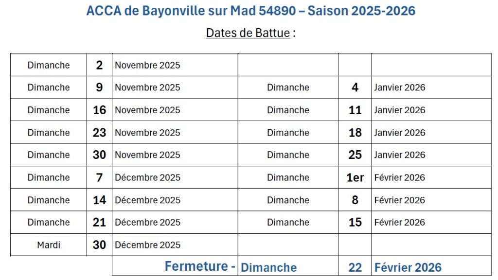 ACCA de Bayonville-sur-Mad Saison 2025-2026 29 septembre 2025 Dates de battue – Grand Gibier Saison de chasse 2025-2026 ACCA de Bayonville sur Mad Dates Battue Saison 2025-2026 Navigation de l’article Previous Previous post: Conseil Municipal V.26 septembre 2025Next Next post: Rapport Annuel EAU 2024
