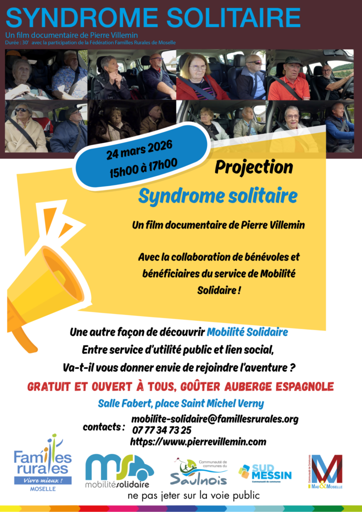 Nous projetterons le film « SYNDROME SOLITAIRE » réalisé par Pierre VILLEMIN, professeur en vidéo à l’école des Beaux-Arts, qui porte sur le quotidien des bénéficiaires et des conducteurs bénévoles du service.