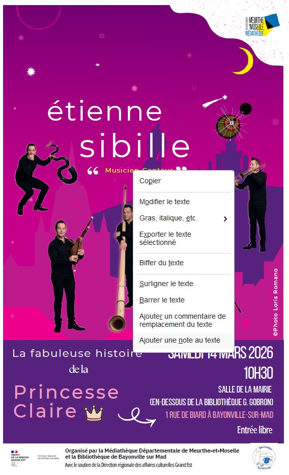 La fabuleuse histoire de la Princesse Claire S. 14 Mars à 10h30 26 février 2026 Samedi 14 Mars 2026 10h30 Entrée libre Navigation de l’article Previous Previous post: Invitation Mobilité Solidaire